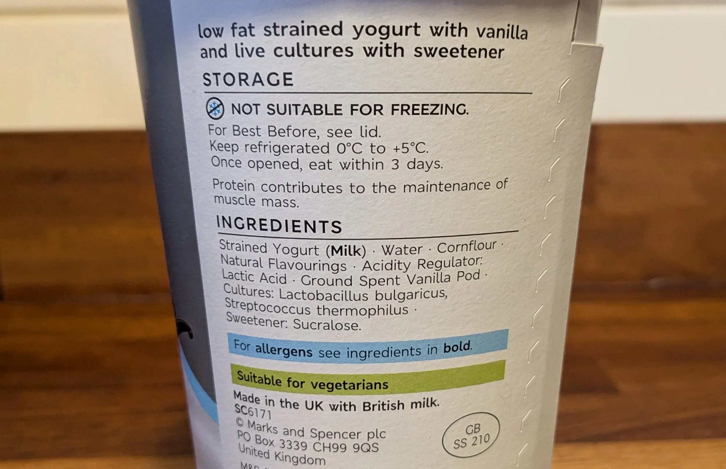 The ingredients are: strained yogurt (milk), water, cornflour, natural flavourings, acidity regulator (lactic acid), ground spent vanilla pod, live cultures and sweetener (sucralose).