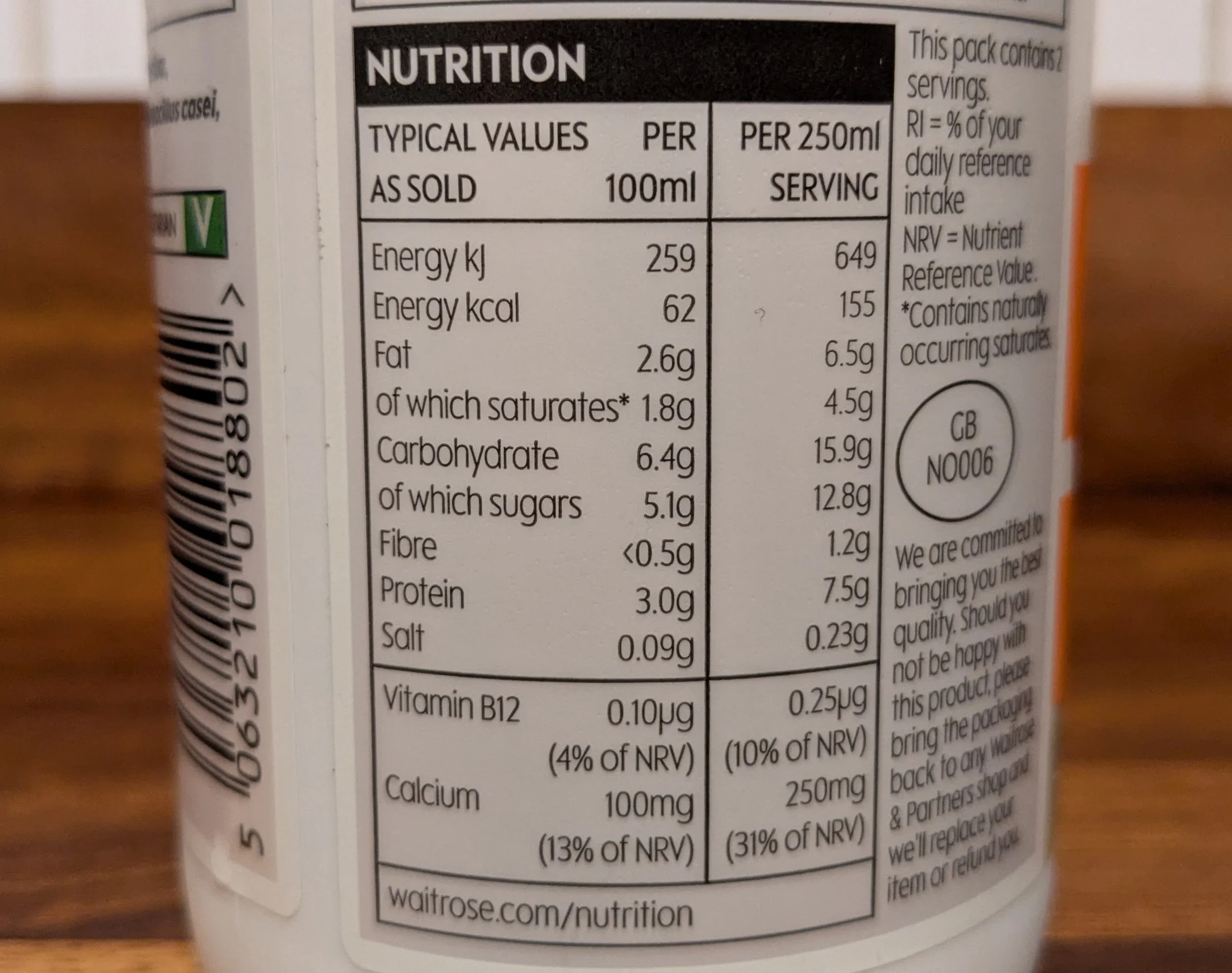 Most important to note is that it is not made with kefir grains, but rather by inoculating it with a starter culture. This is likely why Waitrose calls it a ‘kefir drink’ and ‘fermented milk drink’ on the label. To be honest, many other brands make kefir in the same way and are just less upfront about it ¯\_(ツ)_/¯