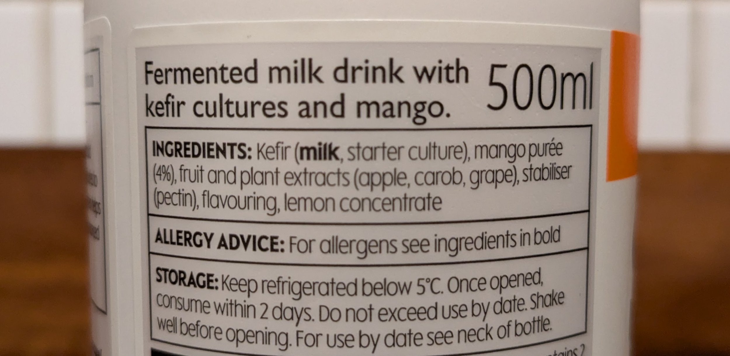 It contains kefir (milk, starter culture), mango purée (4%), fruit and plant extracts (apple, carob, grape), stabiliser (pectin), flavouring and lemon concentrate.