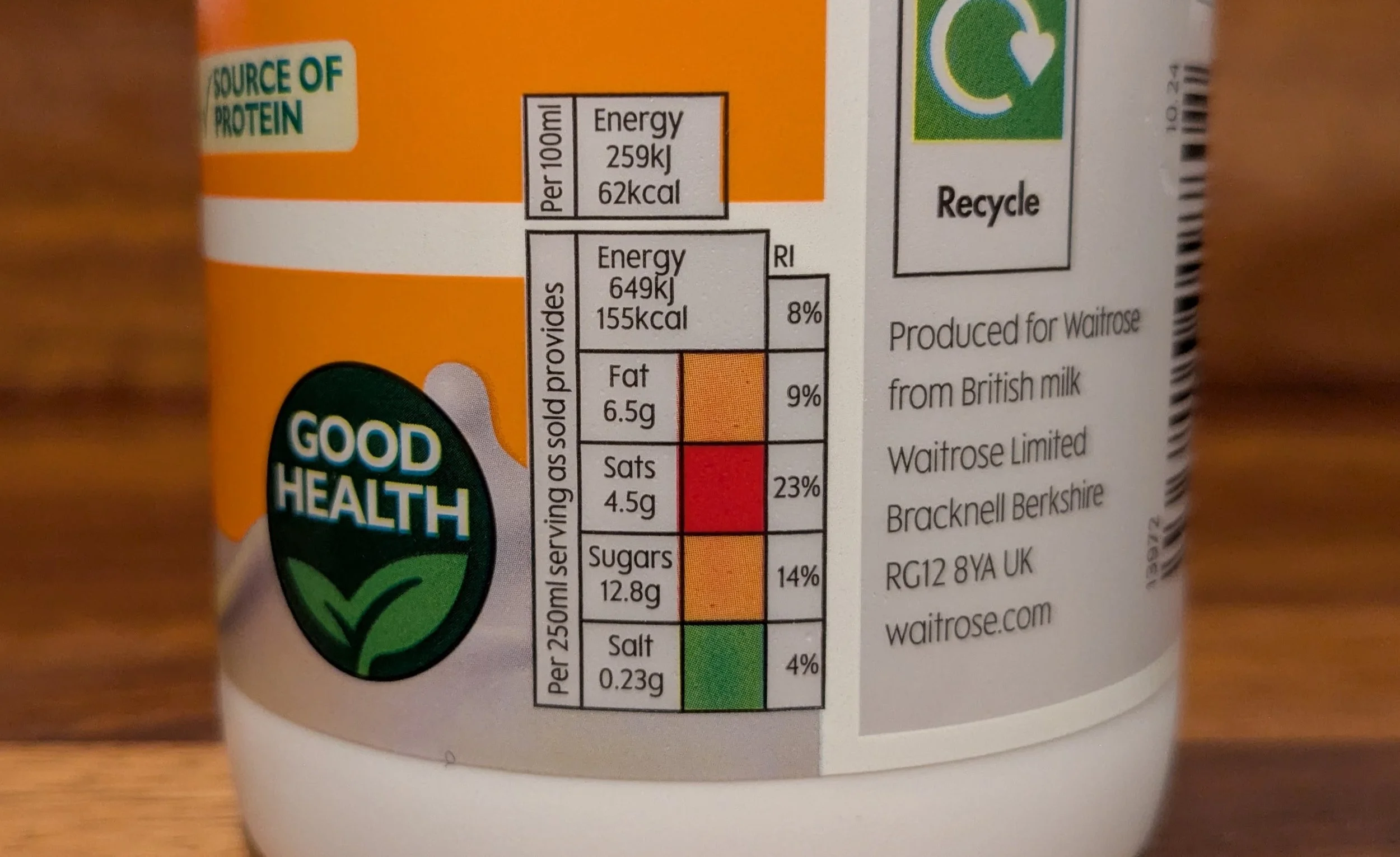 Fat: It also has moderate levels of fat at 2.6%, which is above that of Yeo Valley (1.9%).